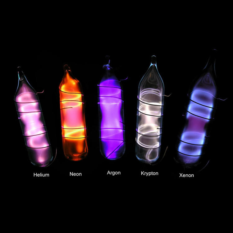 不同的氣體在不同的條件下會(huì)發(fā)出不一樣的光,一般氦氣—-橘紅 ,氖氣—-紅,氬氣—-藍(lán)紫氪氣—-黃綠,氙氣—-與陽(yáng)光顏色相同。
